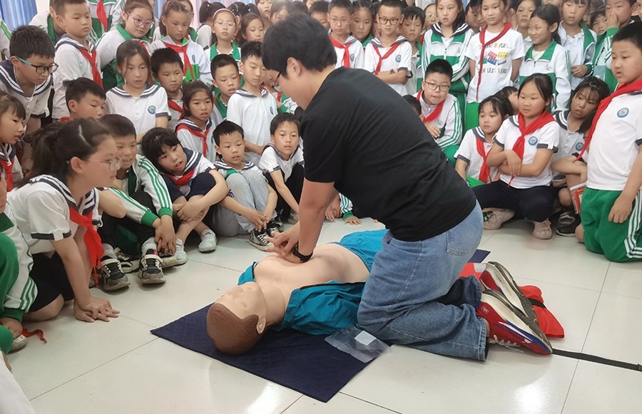市水上義務(wù)搜救中心工作人員向同學(xué)們演示了在水中遇到意外時(shí)高舉手臂大聲呼救、仰泳露鼻、深吸淺呼、觀察四周有無可增加浮力的東西、發(fā)現(xiàn)抽筋時(shí)如何排解等內(nèi)容。教學(xué)過程中還設(shè)置了有獎(jiǎng)問答、互動(dòng)練習(xí)等環(huán)節(jié)。該中心還向?qū)W校贈(zèng)送了150本《水上交通安全教育讀本》,20余件救生圈、救生衣等應(yīng)急物資。