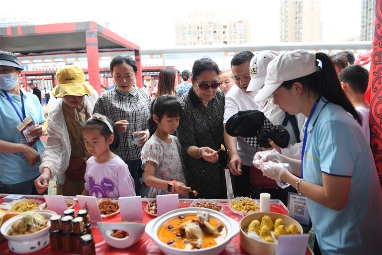 一邊,灶臺上的魔術(shù),讓食材變美食。另一邊,入選潛江美食地圖的60家特色美食名店也展示著自己的招牌,上百種特色美食琳瑯滿目。