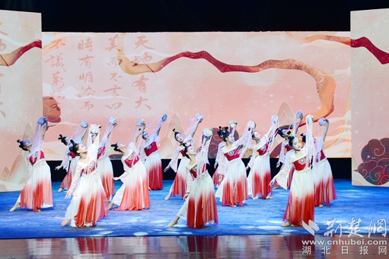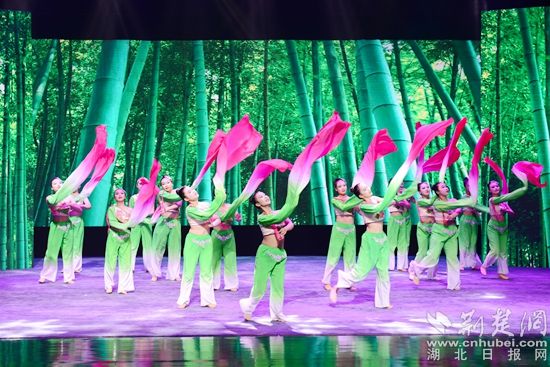 舞蹈《且吟春雨》《看了你一眼》婀娜曼妙,韻味十足。舞蹈《把愛寄回家》纏綿婉轉(zhuǎn),真情再現(xiàn)了一群留守兒童收到父母的快遞,思念父母的情景,表達留守兒童的心聲和期盼,呼吁社會給予他們更多的關(guān)愛。舞蹈《楚鼓聲聲》鏗鏘有力,再現(xiàn)了泱泱大國威武雄風(fēng)。