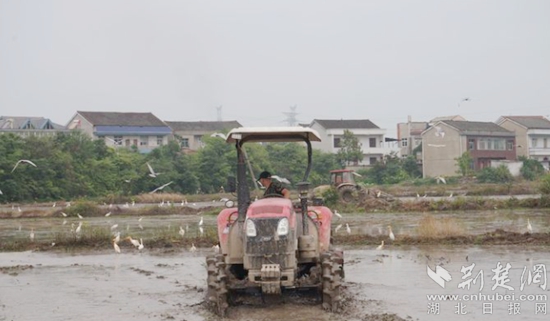 水田中,打田機(jī)來回穿梭,工人們?cè)诿χ嗨?、播種,到處都是一片生機(jī)勃勃的繁忙景象。一群群白鷺鳥在人與機(jī)器之間飛來飛去嬉耍,織就出一幅喜樂祥和的圖畫。