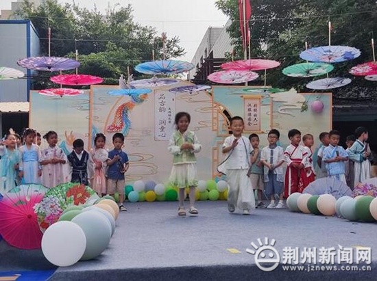 合唱《唱臉譜》、舞蹈《孩子的天空》、情境表演《普羅米修斯》等精彩的文藝節(jié)目輪番上演,沙市北京路第三小學的孩子們身穿各種特色服裝,用心演繹著經(jīng)典故事,用歌聲慶祝著自己的節(jié)日。校園內(nèi),還展示著學生們手工制作的服飾、圍巾、精美花束、扇面畫等藝術(shù)作品,營造出濃濃的六一氛圍。