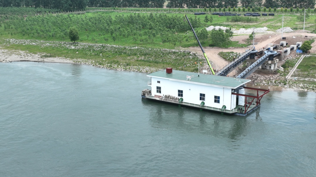 工程于2022年5月6日開工建設(shè),2023年5月31日試運(yùn)行通水。新建的蛟子泵站采用浮船設(shè)計(jì),是石首市首個(gè)浮船式灌溉泵站。浮船長38米、寬12米,設(shè)計(jì)吃水深度為1米,設(shè)計(jì)流量為6.15m3/s,裝機(jī)功率為3*450KW。浮船連接兩根40米跨度的搖臂,泵站通過搖臂輸水鋼管和預(yù)制混凝土管,引水入銀海渠。