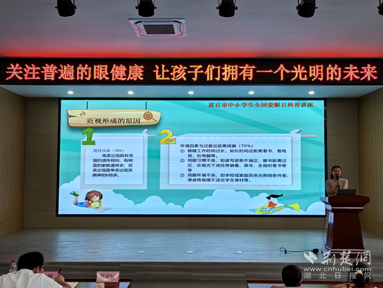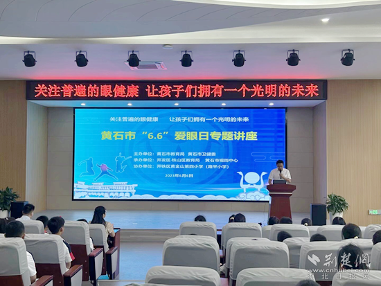 當(dāng)天,由黃石市教育局、黃石市衛(wèi)健委主辦,開發(fā)區(qū)·鐵山區(qū)教育局承辦的“6·6全國(guó)愛眼日——關(guān)注普遍的眼健康”科普教育講座活動(dòng),在黃金山第四小學(xué)舉行。