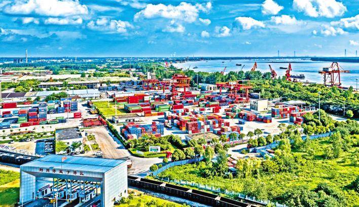 6月8日,長江荊州段碧水悠悠,過往船舶汽笛聲此起彼伏。鹽卡港碼頭上,紅色門機(jī)將一個(gè)個(gè)集裝箱緩緩吊起,穩(wěn)穩(wěn)地放到貨輪上。