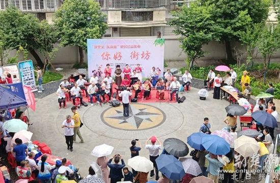 攤位前方,濠塘社區(qū)“藝家協(xié)會(huì)”的文藝志愿者們?yōu)榇蠹規(guī)砹司始姵实墓?jié)目,京劇《紅燈記》、《沙家浜》喚起居民的紅色記憶,小品《老倆口逛鄂州》帶大家回顧了鄂州的發(fā)展巨變,贏得大家陣陣掌聲。