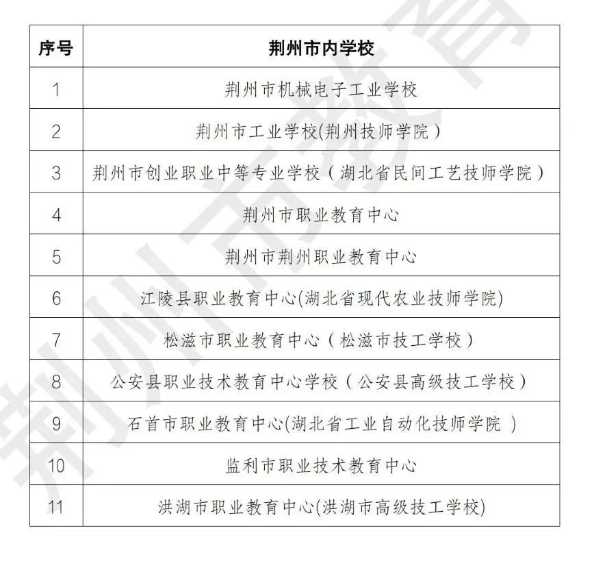 除以上學(xué)校之外的其他中職(技工)學(xué)校均未經(jīng)荊州市教育部門備案,不具備在荊州市范圍內(nèi)招生資格。