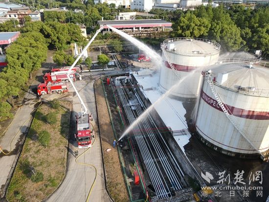 此次拉動演練設(shè)定西塞山油庫一罐體由于施工滲漏導(dǎo)致圍堰內(nèi)形成流淌火,情況危急。災(zāi)情發(fā)生后,企業(yè)立即啟動應(yīng)急預(yù)案,并撥打119報警。市消防救援支隊(duì)按照輕型化工滅火救援編隊(duì)編成,立即出動通信指揮、舉高噴射、滅火冷卻、戰(zhàn)勤保障4個作戰(zhàn)單元,總計16車50人。運(yùn)用防火堤池火撲救戰(zhàn)術(shù),進(jìn)行“三梯次三疊加”泡沫覆蓋,實(shí)現(xiàn)低、中、高倍數(shù)泡沫疊加覆蓋。