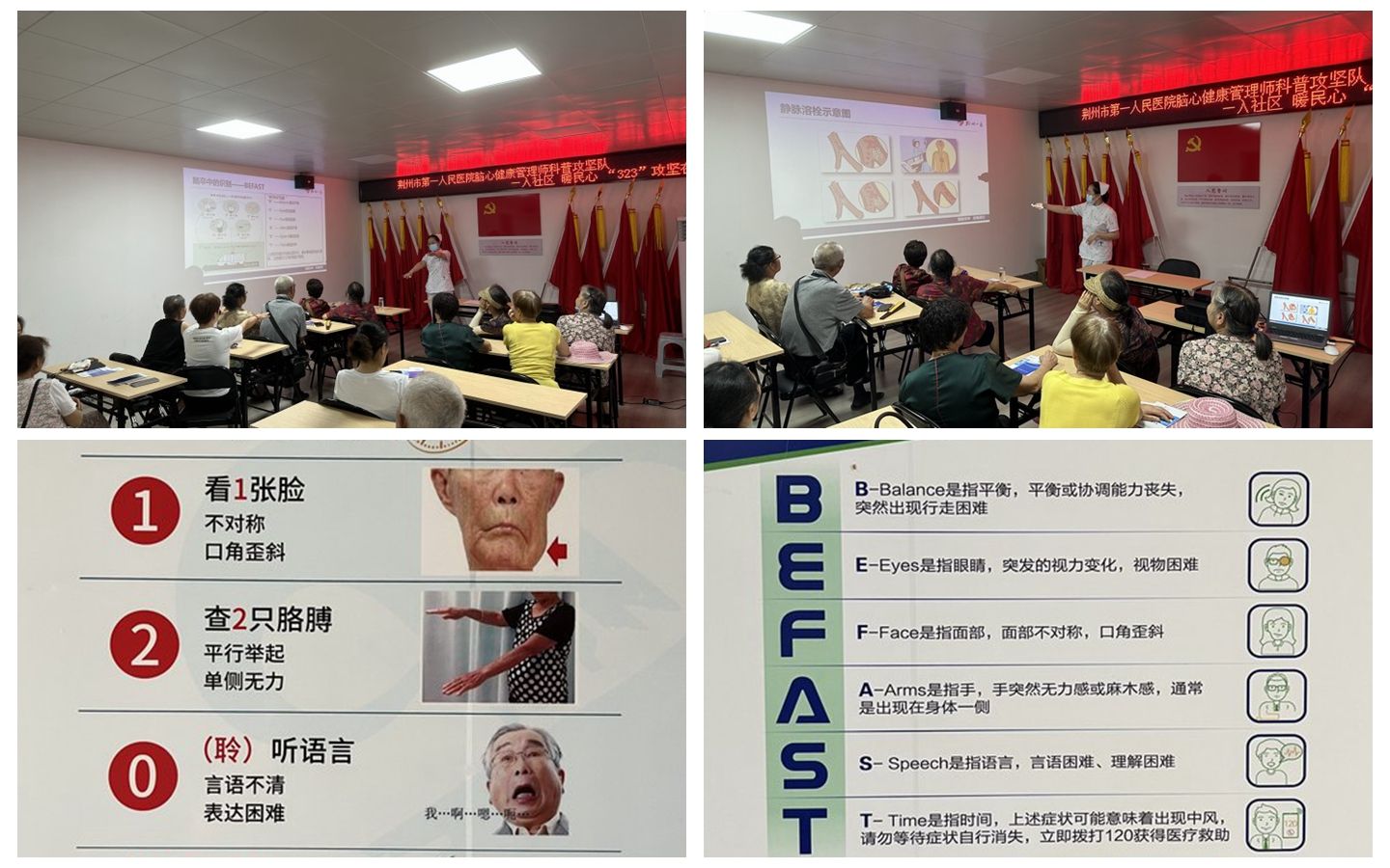在活動(dòng)現(xiàn)場(chǎng),布置了條幅、展板,腦心健康管理師以幻燈片放映的方式,用通俗易懂的語(yǔ)言、生動(dòng)形象的圖片為中老年居民講述腦卒中疾病的防治及醫(yī)院急救綠色通道。