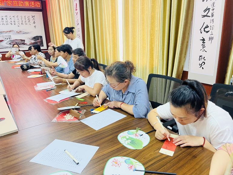 活動(dòng)中,30名女性黨員干部及部分干部家屬在講解員的引導(dǎo)下,參觀了清廉家風(fēng)館的各個(gè)版塊,在近現(xiàn)代廉政家風(fēng)家訓(xùn)、模范家庭典型事跡、優(yōu)秀共產(chǎn)黨員家風(fēng)故事中汲取良好家風(fēng)助廉、倡廉的精神力量;通過聆聽“五老”志愿者的授課,大家感悟著家風(fēng)助廉的理念細(xì)節(jié),并紛紛執(zhí)筆,自發(fā)在家庭助廉倡議書上簽下姓名,表達(dá)自己作為廉潔家風(fēng)的傳播者和踐行者的決心;在非遺剪紙傳承人的輔助下,大家完成了清廉家風(fēng)主題的剪紙,通過一剪一刀,將新時(shí)代清廉家庭文化與民族民俗剪紙進(jìn)行凝練融合,以巧手精裁倡揚(yáng)清風(fēng);筆墨潤(rùn)廉中,大家在空白書簽、扇子上以書法形式寫下經(jīng)典清廉家風(fēng)詩文及相關(guān)廉政家訓(xùn)。