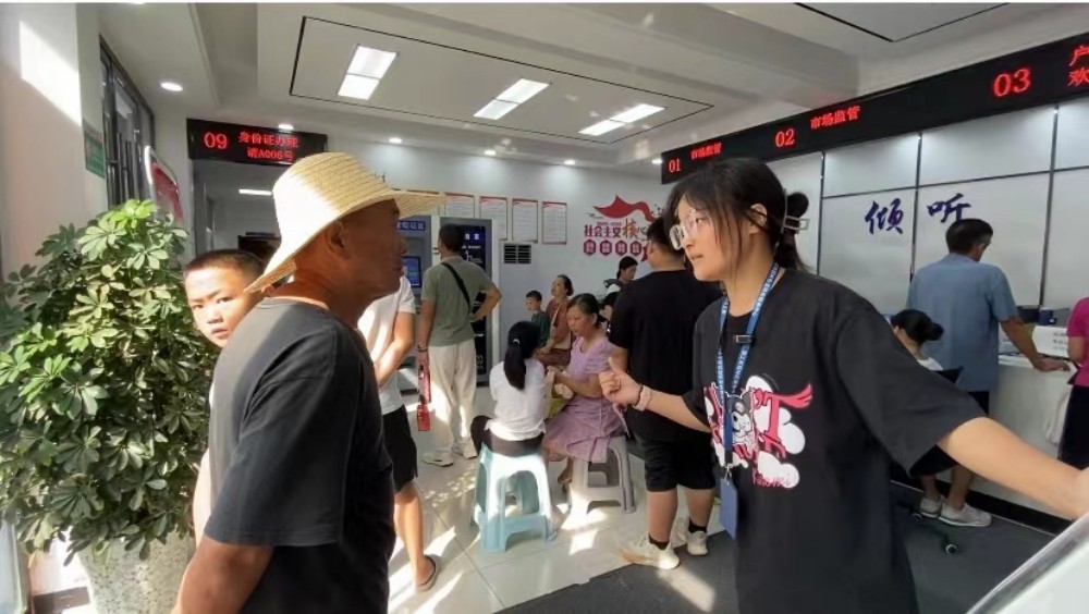 “戶口是在園林派出所嗎?您先取個號,然后排隊等叫號,我們中午不下班,辦的還算快?!贝髮W(xué)生志愿者廖鶯昊對前來辦證的市民說道。