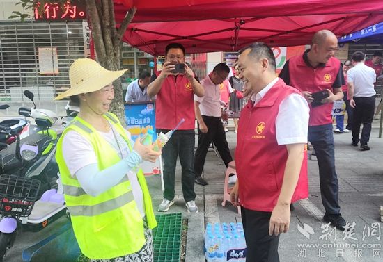 “歡迎到獻(xiàn)血車納涼歇腳,不獻(xiàn)血也可以免費(fèi)飲用礦泉水?!被顒?dòng)當(dāng)天,見一名環(huán)衛(wèi)工人在獻(xiàn)血車旁駐足觀望,身穿志愿服務(wù)馬甲的紅安縣衛(wèi)健局副局長蔡霖快步上前,遞上水和果汁。