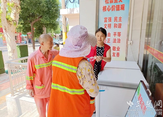 “長期在室外高溫天氣下工作,每天都有揮汗如雨的感覺,渴了累了都能來喝杯水、歇歇腳真的很暖心,謝謝你們的關(guān)心和心意”,環(huán)衛(wèi)工人李師傅說。