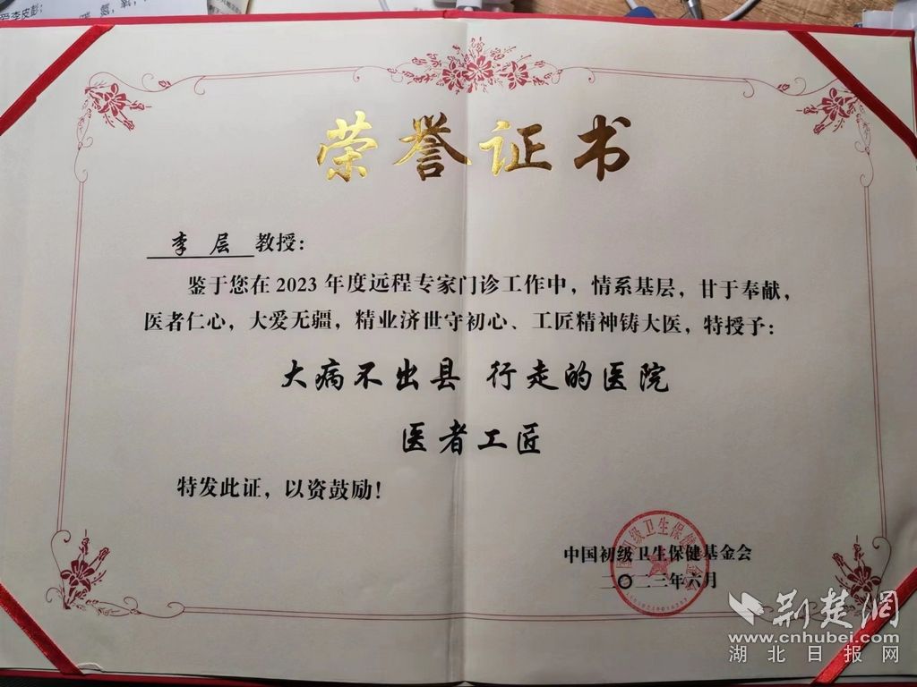 扛牢責(zé)任全力服務(wù)大局,奮進(jìn)“不負(fù)韶華”。加班加點(diǎn)、利用雙休日義診是李層的工作常態(tài)。連他自己也記不清已多少次加入基層干部組成的志愿團(tuán)隊(duì),前往農(nóng)村、社區(qū)和學(xué)校開展義診、舉辦講座。同時(shí),運(yùn)用好中醫(yī)藥治療這個(gè)“法寶”,在如何用好“一把草”,用活“一根針”上,不斷專研創(chuàng)新,把用經(jīng)方、調(diào)膏散、小針刀作為治療頸肩腰腿痛的“秘方”不斷傳遞。日前,由中國(guó)農(nóng)工民主黨中央主辦的中國(guó)初級(jí)衛(wèi)生保健基金會(huì)和北京協(xié)和醫(yī)學(xué)院、《中國(guó)初級(jí)衛(wèi)生保健》雜志共同主辦,中國(guó)國(guó)際投資促進(jìn)會(huì)振興與發(fā)展工作委員會(huì)和中國(guó)國(guó)際投資促進(jìn)會(huì)智慧健康投資促進(jìn)工作委員會(huì)協(xié)辦的“首屆中國(guó)鄉(xiāng)村醫(yī)生公益大會(huì)”在“北京會(huì)議中心”隆重召開,并對(duì)李層頒予“大病不出縣,行走的醫(yī)院”之“醫(yī)者工匠”光榮稱號(hào)證書。