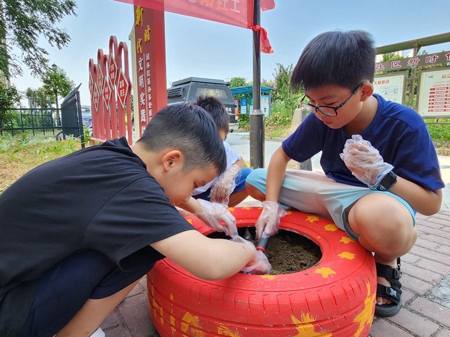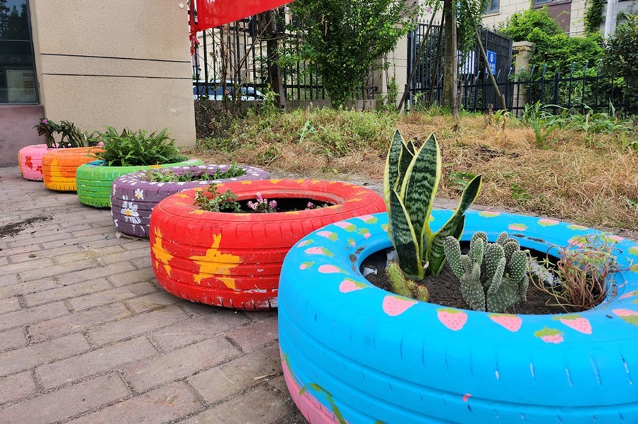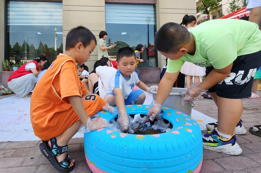 勾線、平涂、點彩,當天上午,小朋友們在社區(qū)工作人員的幫助下,發(fā)揮想象力與創(chuàng)造力,套上手套、擼起袖子,為一個個黑乎乎的輪胎披上了顏色鮮艷的“新衣”。大家鏟土、澆水,合力將仙人掌、虎皮蘭等植物種入輪胎花盆中,把廢舊輪胎變成了一個個色彩斑斕的手繪花盆。雖然天氣炎熱,但是大家一起體驗了勞動的快樂??粗约河H手彩繪裝飾的舊輪胎變廢為寶,大家都充滿成就感。