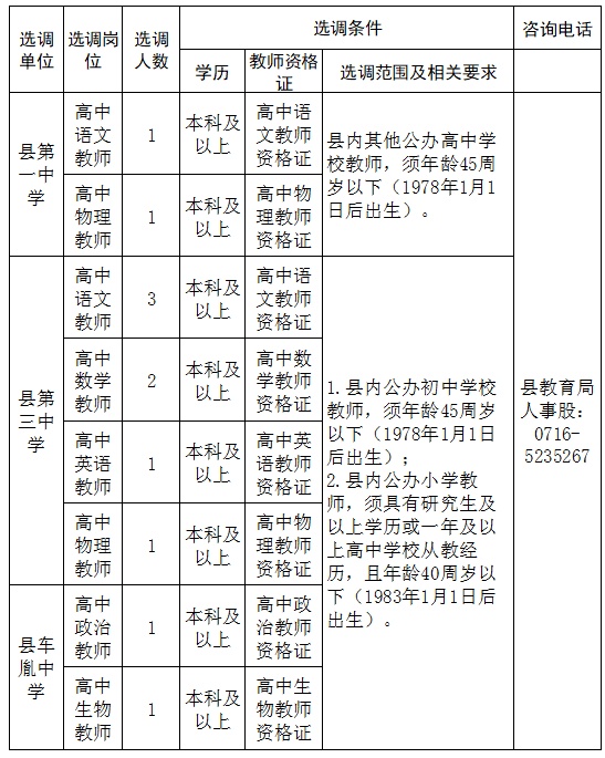 聯(lián)系電話:縣教育局人事股 0716-5235267