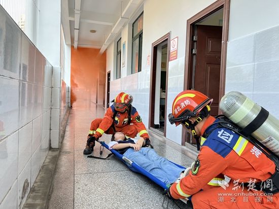 伴隨著陣陣緊促的警笛聲在校園響起,一教室內“電線短路”,引燃桌面書籍,頓時濃煙滾滾?!罢埜魑煌瑢W不要驚慌,捂住口鼻、低頭彎腰、貼墻往樓下有效進行疏散......”廣播中傳來疏散指令,消防員指導全體師生從“安全出口”有序迅速撤離,通過體驗“生命通道”,使師生掌握火場疏散逃生技能。