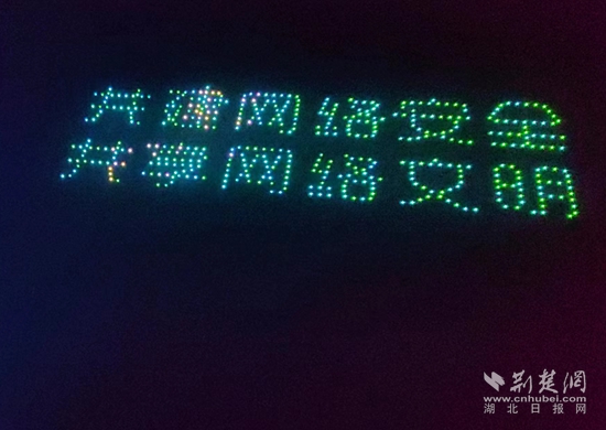 夜空中,數(shù)百架無人機以天空為畫布、以光影為畫筆,描繪出一幅幅科技與視覺的“大片”。表演融入網(wǎng)絡視聽元素和黃石、湖北地標內(nèi)容,依次幻化成小燕子、天空之城、黃石歡迎你、地球、安全盾牌等11個畫面,最終匯集成“共建網(wǎng)絡安全 共享網(wǎng)絡文明”的字樣。
