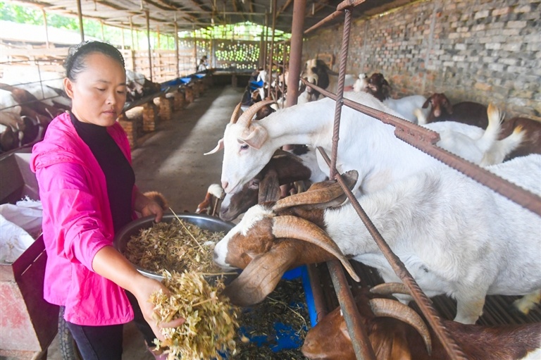 9月8日,王場鎮(zhèn)河堤村楊繼云在養(yǎng)殖場投放豆梗喂羊。楊繼云介紹,羊吃的飼料沒有任何添加劑,除自家配套種植的17畝玉米和黑麥草外,都是從各農(nóng)戶田中收集的花生、玉米、紅苕梗,通過粉碎加工后轉(zhuǎn)化為飼料,羊吃了這些飼料長得壯,肉質(zhì)細(xì)嫩,深受消費(fèi)者歡迎,去年自繁自養(yǎng)的140余頭波爾山羊出欄90頭,獲收入15萬余元。
