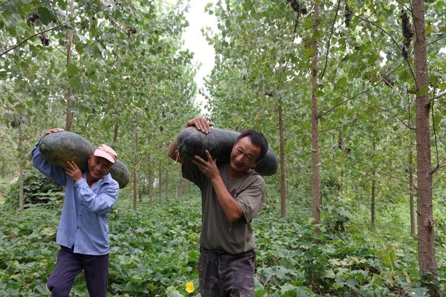 清晨,攜一縷陽光,9畝意楊林地里,一個個又粗又長的冬瓜掩映在藤葉之間,楊湖村村副主任張滿義和村民身影來回穿梭其間,扛出一個又一個碩大的冬瓜,笑容浮現(xiàn)在他們臉上。