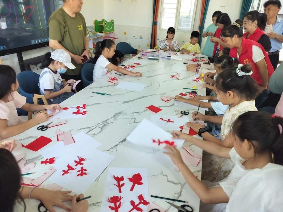 當(dāng)天,服務(wù)站邀請(qǐng)“潛江剪紙”非物質(zhì)文化遺產(chǎn)傳承人宋成美老師為孩子們授課。在宋老師的悉心指導(dǎo)下,畫紙折疊翻轉(zhuǎn),剪刀起起落落,學(xué)生們用一張張普通的紙和一把小小的剪刀,剪出了一幅幅精美的作品。