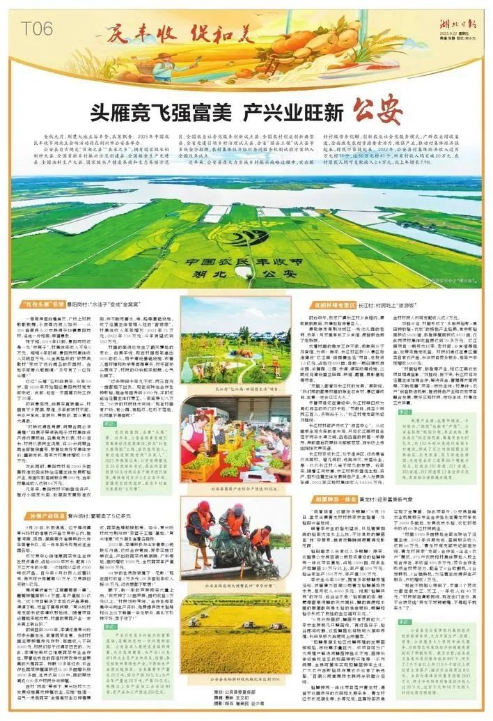 9月23日,2023年中國(guó)農(nóng)民豐收節(jié)湖北主會(huì)場(chǎng)活動(dòng)將在荊州市公安縣舉辦。9月22日,湖北日?qǐng)?bào)《慶豐收 促和美》特刊中刊發(fā)整版報(bào)道《頭雁競(jìng)飛強(qiáng)富美 產(chǎn)興業(yè)旺新公安》,揭秘公安縣是怎樣讓村集體經(jīng)濟(jì)強(qiáng)起來、村民口袋鼓起來。