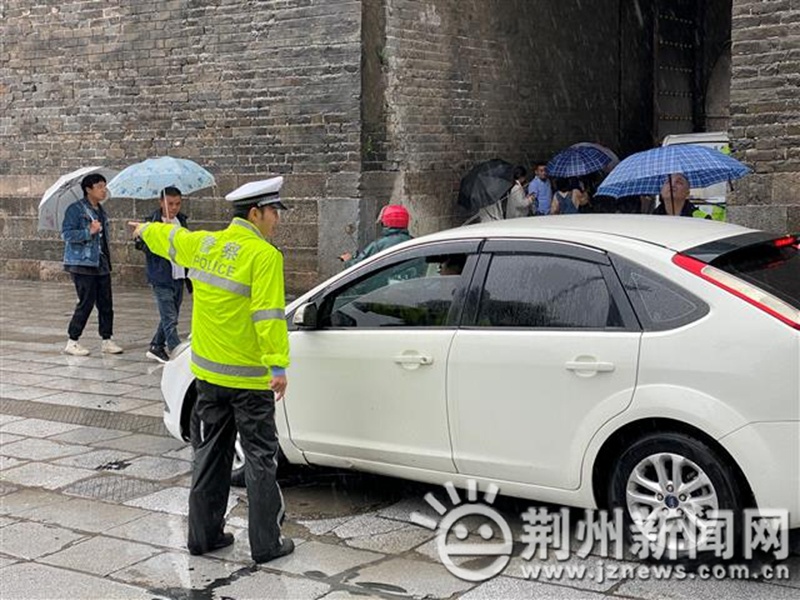 10月3日上午10點,雖然空中下著雨,但在荊州古城賓陽樓路段,已有不少游客前來觀光,荊州市公安局交管局一大隊民警正在此值守,指揮車輛有序通行。在賓陽樓城墻路段,一排外地車輛依次單邊有序停放,這讓外地來的游客省去了來回找車位的麻煩。
