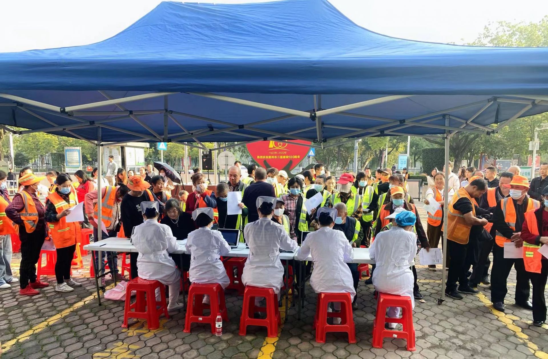 醫(yī)護(hù)人員為環(huán)衛(wèi)工人們測量血壓 記者 喻昭陽 攝