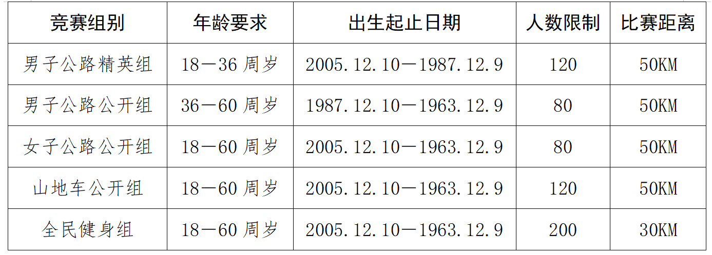 賽事全程50KM,共分為男子公路精英組、男子公路公開組、女子公路公開組、山地車公開組、全民健身組五個組別。