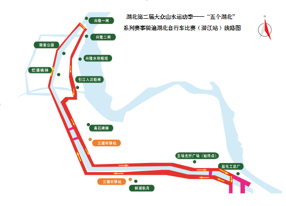 本次賽事線路:王場鎮(zhèn)光纖廣場(起點)→王張路→紅旗路→化工路→江漢鹽化工興隆河老橋(右轉(zhuǎn))→王高路→周東線→興王路→興隆一閘(右轉(zhuǎn)折返)→漢江大堤→興隆水利樞紐→漢江大堤(右轉(zhuǎn)下坡)→村級公路(左轉(zhuǎn))→鹽興線→光纖廣場(終點),其中:榮譽(yù)騎行2.25公里至江漢鹽化工總廠老橋。