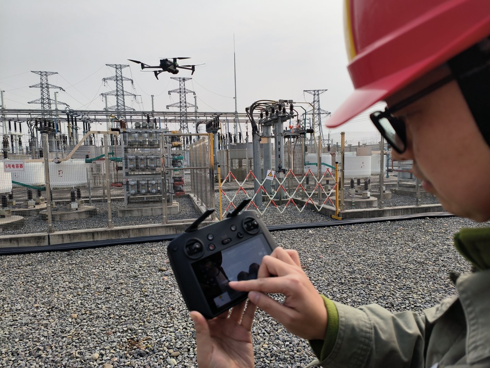 荊州變電運(yùn)維分公司公安運(yùn)維站副站長覃立明操作無人機(jī)巡檢220千伏油江變電站內(nèi)設(shè)備 吳可 攝