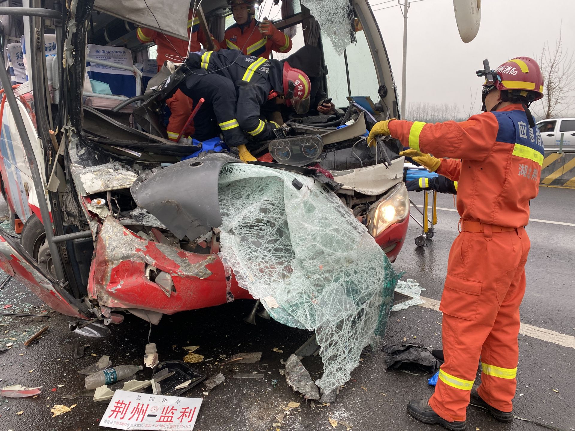 消防救援人員到場發(fā)現(xiàn),大貨車車尾已嵌入客運車駕駛室,客運車車頭損毀嚴重,擋風(fēng)玻璃完全破碎,一名中年男子被卡在駕駛室內(nèi)動彈不得,好在意識比較清醒;右邊第一排座位上的老人滿臉是血,雙腿被擠壓的車頭緊緊卡住,表情十分痛苦。