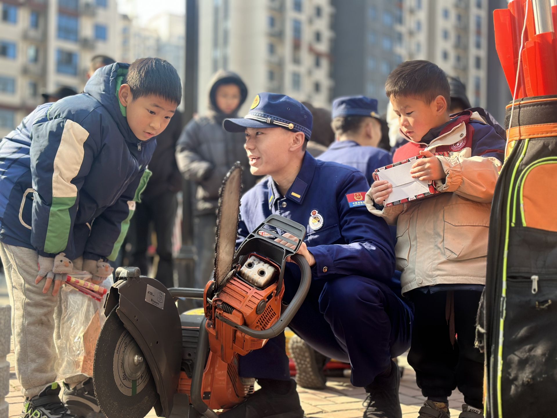 活動現(xiàn)場還展示了消防救援液壓擴張器、無人機、遠距離水上救生拋投器等消防救援器材,引得群眾紛紛駐足,紛紛親身體驗消防裝備使用操作,過一把“消防癮”?!皼]想到無人機有這么大,切割機有這么重?!薄跋朗迨搴每?,長大我也要當消防員?!焙⒆觽円舶严佬麄魅藛T團團圍住,個個聽得聚精會神。