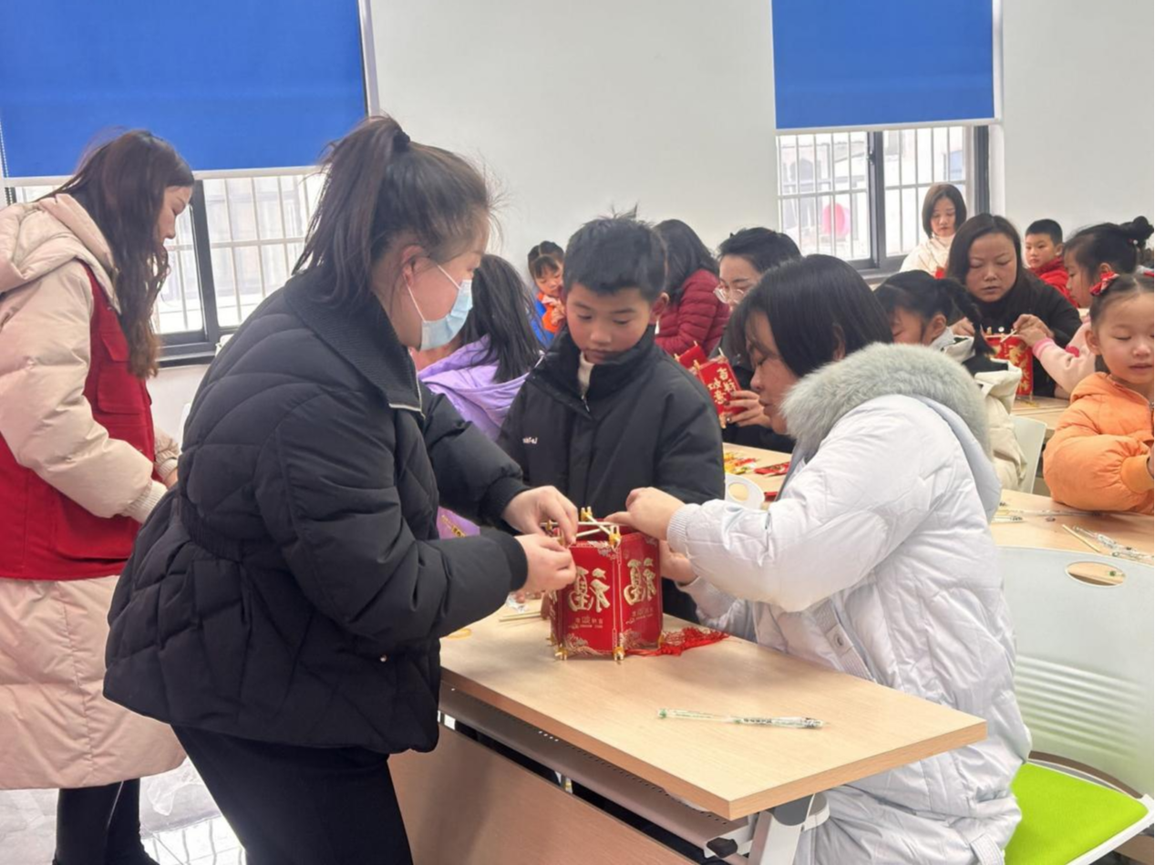 在社工的帶領(lǐng)下,在場的家庭代表積極投入手工制作活動。繞繩、打結(jié),不一會兒,一個個紅燦燦、蘊含著無限祝福的紅燈籠就在大家手中誕生。在社工發(fā)放的賀卡上,小朋友們手繪著自己的美好祝愿,有對父母的、有對師長的、有對社區(qū)老人的。