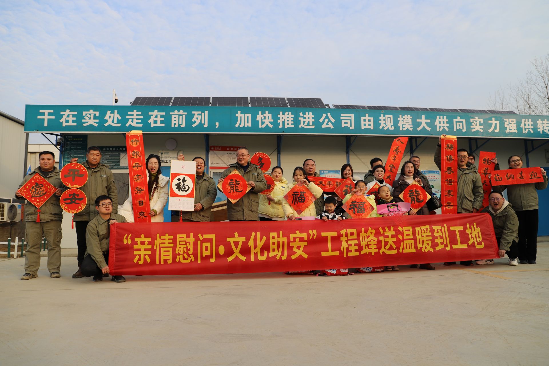 在建設(shè)工地,仙西變電、輸電項(xiàng)目經(jīng)理介紹近期工作安排,宣讀《安全倡議書》,與職工家屬一同簽訂《親情承諾書》;工會(huì)為一線職工們送上了慰問品和新年祝福。