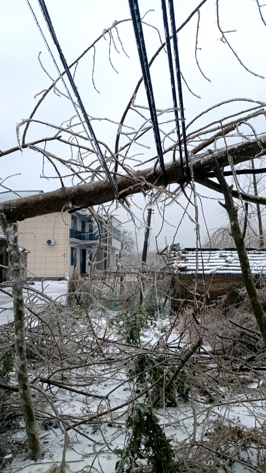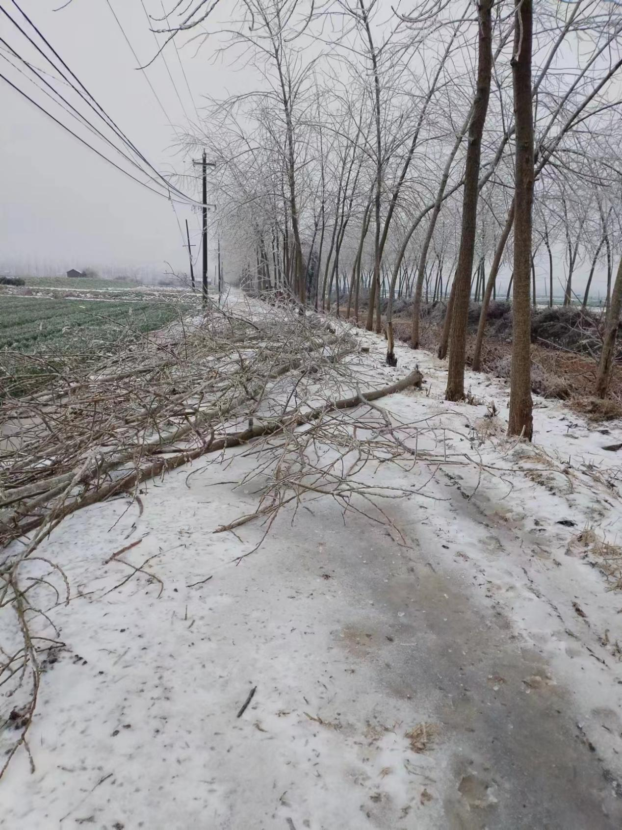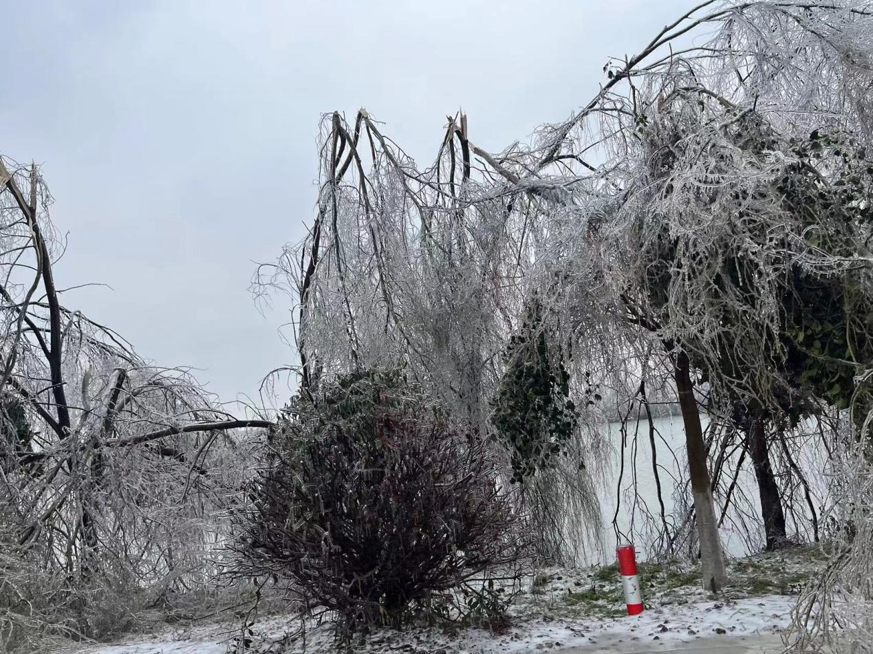 受此輪寒潮凍雨影響,洪湖市內多處樹木覆冰,倒塌眾多,導致多處交通堵塞和線路跳閘甚至斷線情況發(fā)生,極大的影響了居民正常生活。