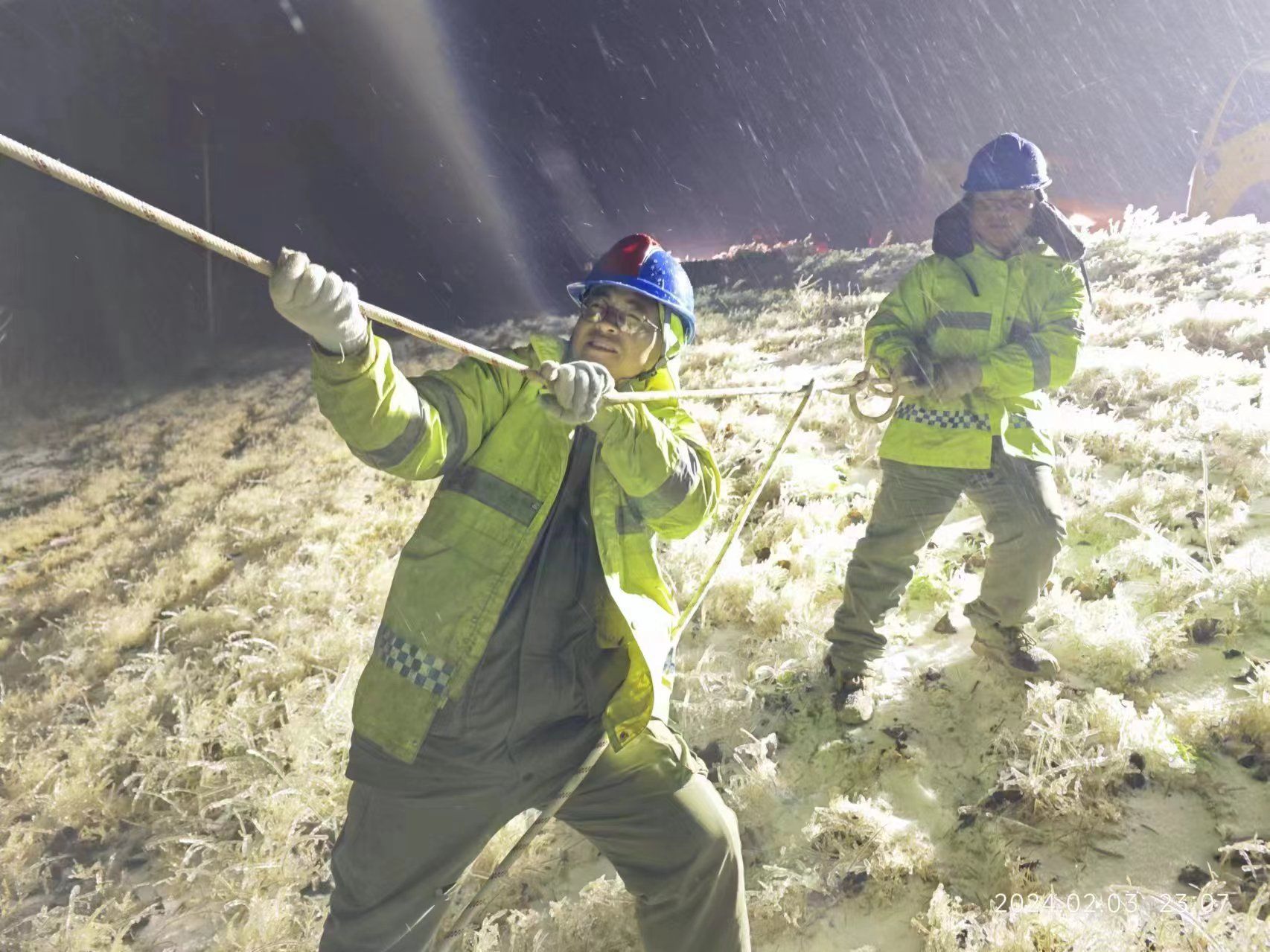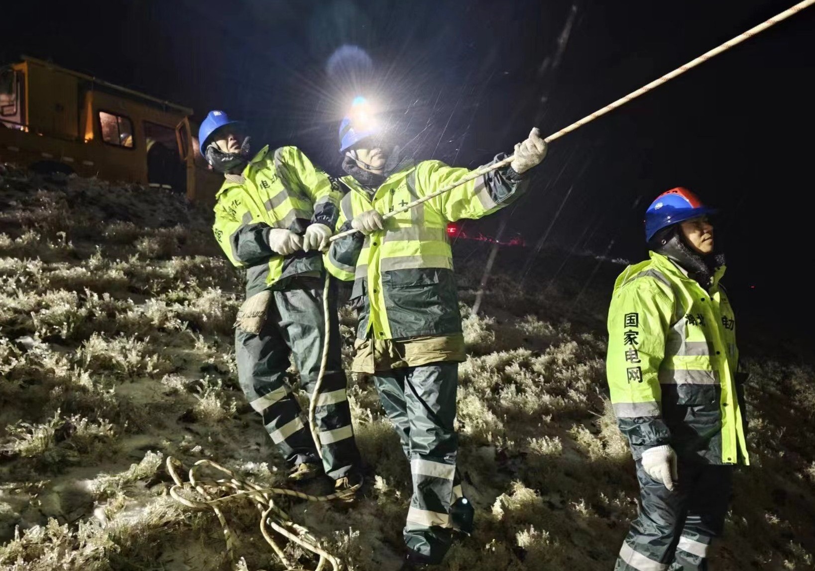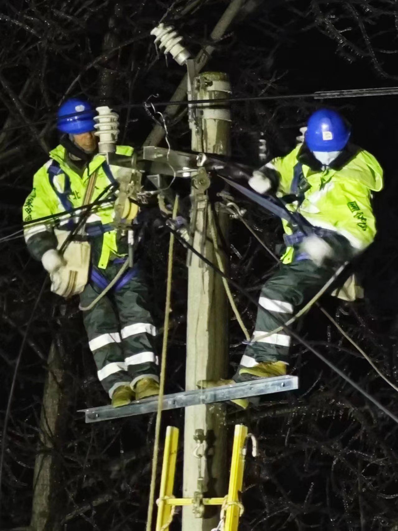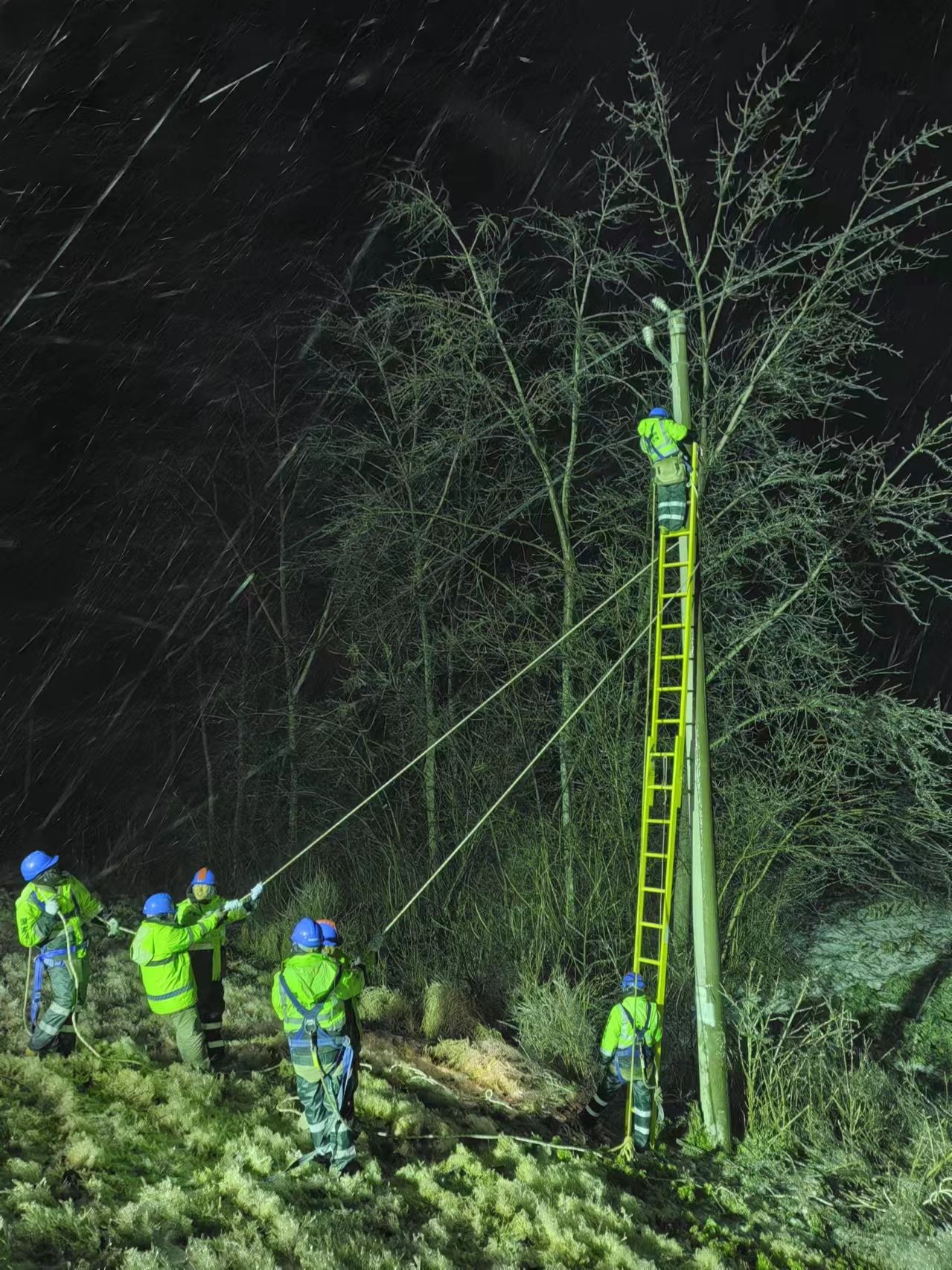 經過緊急研判,決定苦干加巧干,做好充足安全保護措施,架起8米多高伸縮梯讓隊員登桿搶修。隨即大家分工負責奮力搶修,頂風冒雪桿上作業(yè),人拉肩扛一路放線,坡陡路滑合力推車,車燈、頭燈似星星點燈,眉毛、眼鏡結上冰花。