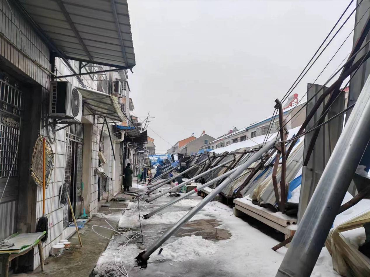得知這一消息,該供電公司“鄂電紅馬甲”率先出動,趕赴現(xiàn)場。經(jīng)勘查,受大雪及凍雨天氣影響,棗林集鎮(zhèn)農(nóng)貿(mào)市場上天棚大面積坍塌,坍塌的棚子直接壓在供電導線上,造成該臺區(qū)80多戶居民受到影響。