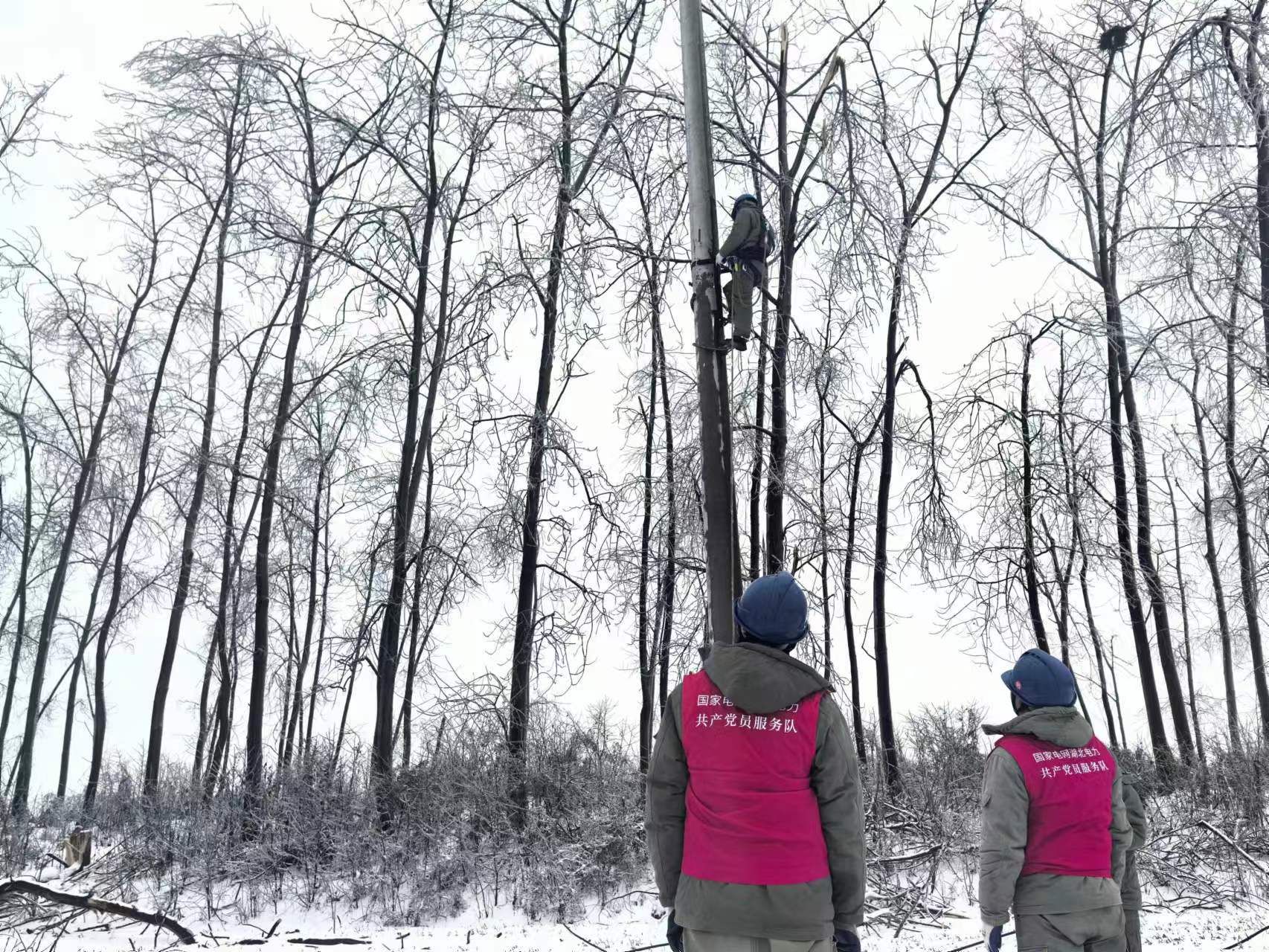 接到公司搶修命令后,荊力集團石首分公司機干分隊第一時間冒風雪趕赴搶修現(xiàn)場,聯(lián)合大垸供電所工作人員進行搶修。由于10千伏大14水廠線線路所處地勢環(huán)境特殊,橫跨樹林、田地和湖泊等地,導致施工車輛難以進入,搶修難度極大。