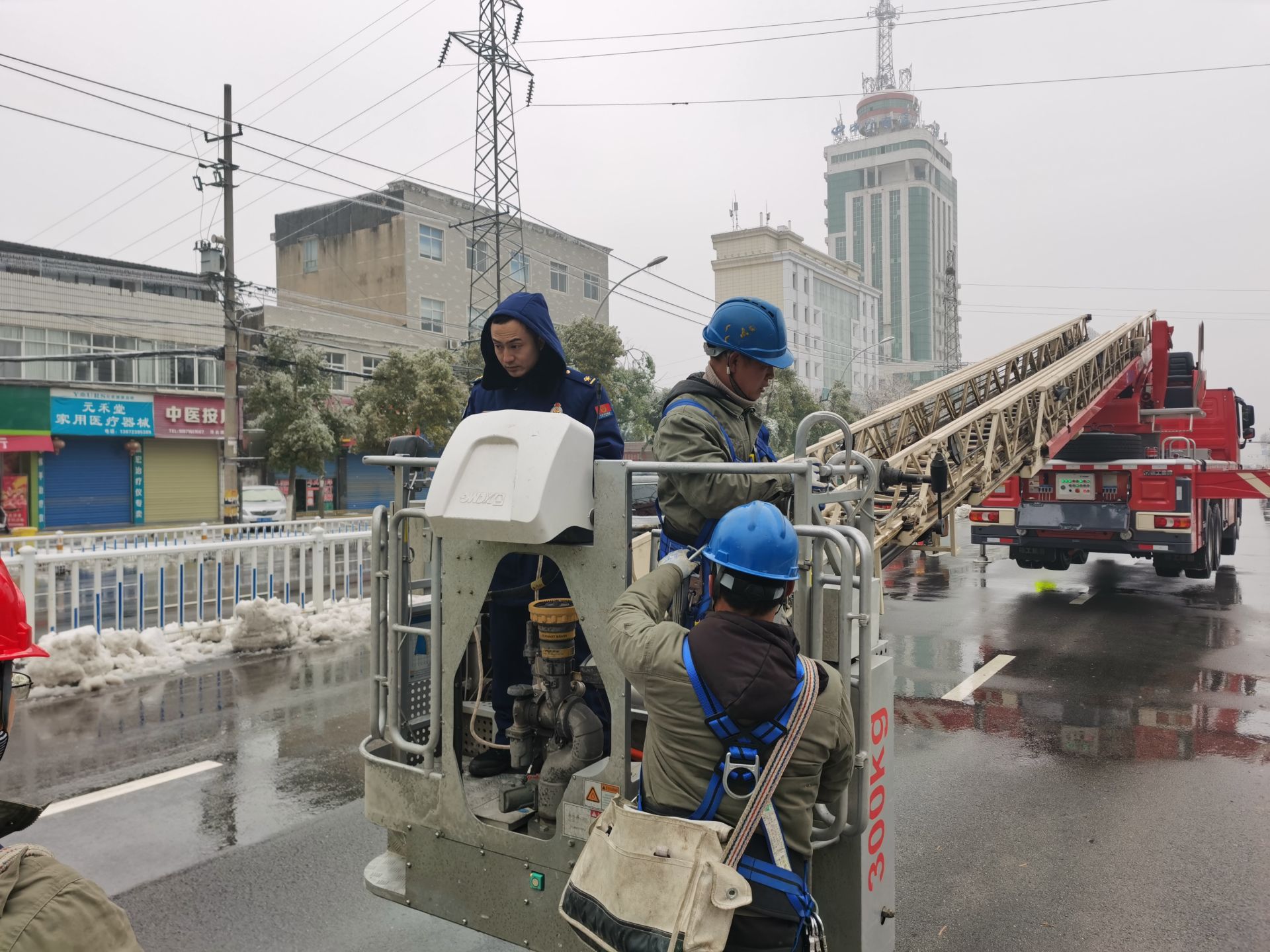 “一定要想辦法加快搶修進(jìn)度!”現(xiàn)場施工負(fù)責(zé)人李維維與同事們商量后,決定向當(dāng)?shù)叵谰仍箨?duì)尋求幫助。洪湖市消防救援大隊(duì)得知這一消息后,緊急派來一輛消防救援車趕往現(xiàn)場進(jìn)行支援。借助消防云梯,搶修人員在最短的時(shí)間內(nèi),升上21米的高空開始了搶修工作。