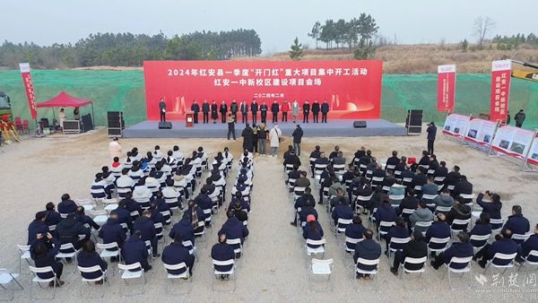 龍騰虎躍迎盛世,將軍故里喜事多。當(dāng)天,紅安一中新校區(qū)建設(shè)項(xiàng)目、陜西國力信達(dá)康養(yǎng)項(xiàng)目、中農(nóng)聯(lián)·紅安國際農(nóng)商城、滬蓉高速紅安聯(lián)絡(luò)線城區(qū)出口連接線等12個(gè)項(xiàng)目現(xiàn)場熱鬧非凡,正在同時(shí)舉行紅安縣一季度“開門紅”重大項(xiàng)目集中開工儀式,吹響“開年即開工、起步即沖刺”的沖鋒號(hào)角,以賽龍奪錦之勢奮戰(zhàn)一季度“開門紅”。
