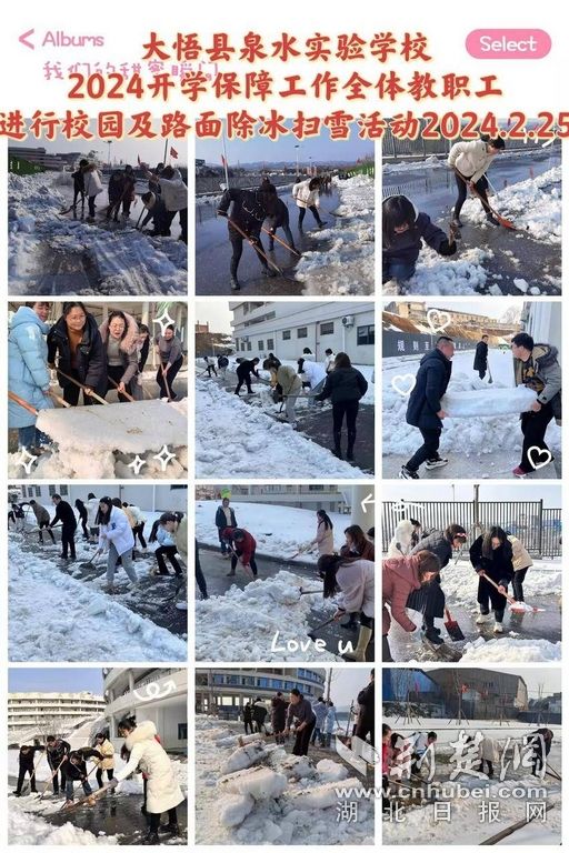 2月25日至26日,大悟中職校、思源實(shí)驗(yàn)學(xué)校、縣直機(jī)關(guān)幼兒園組織、縣泉水實(shí)驗(yàn)學(xué)校分別組織全校教職工對(duì)學(xué)校大門(mén)口、校園內(nèi)各主干道、階梯等重點(diǎn)通行路段進(jìn)行了掃雪除冰,讓校區(qū)的道路變得暢通,干凈清潔,為師生返校營(yíng)造安全、整潔、幸福的環(huán)境。