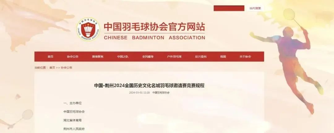 近日,中國羽毛球協(xié)會官方網(wǎng)站發(fā)布了中國·荊州2024全國歷史文化名城羽毛球邀請賽競賽規(guī)程,具體如下:
