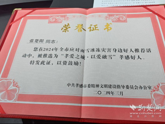 3月1日,孝南區(qū)毛陳鎮(zhèn)龍湖村“00后”大學(xué)生張楚陽因雪中義舉,被授予“孝愛之城·以愛融雪”孝感好人稱號,并現(xiàn)場接受了孝感市政府市長吳慶華的頒獎。