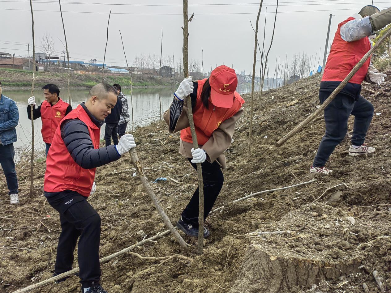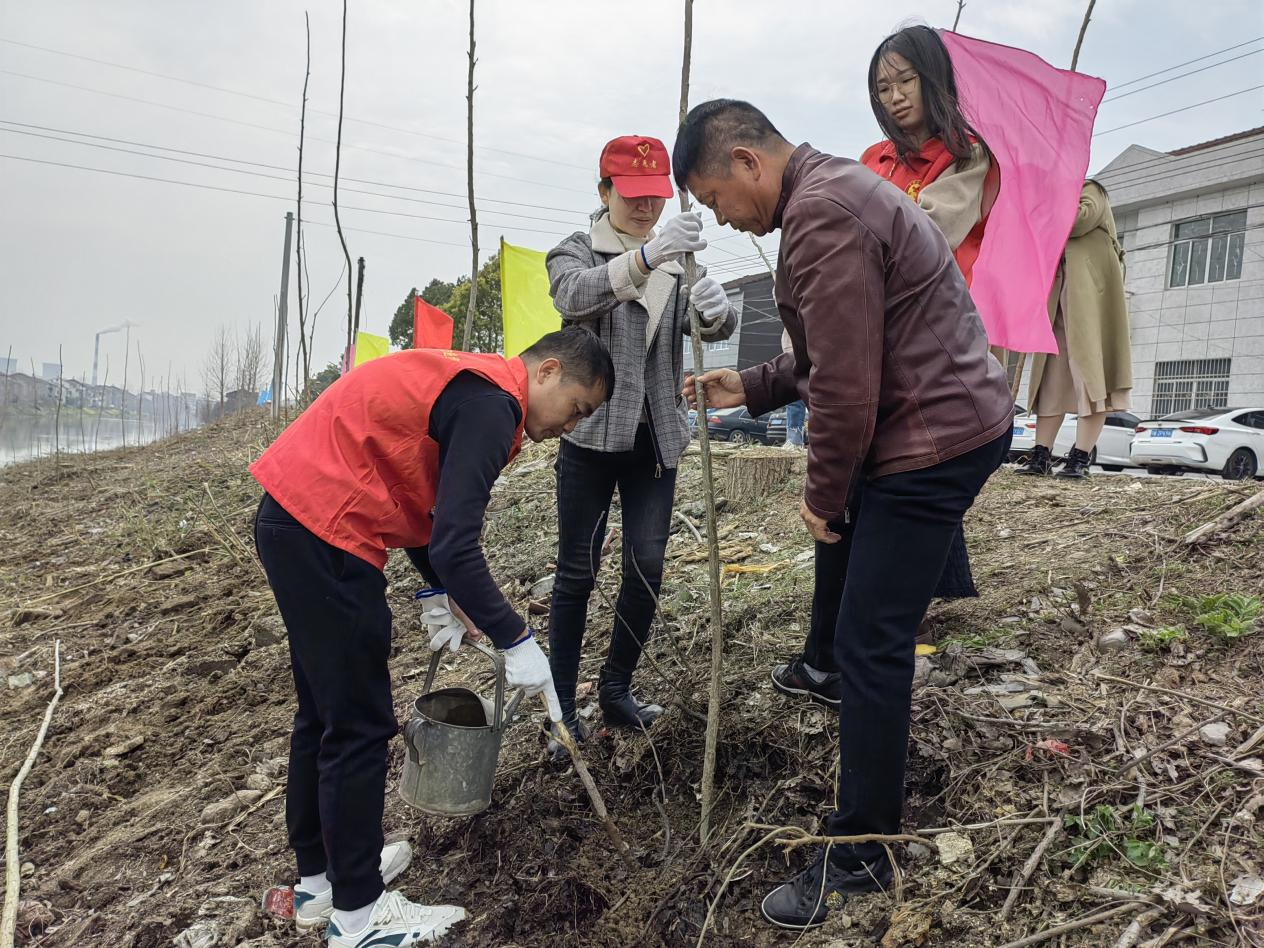 植樹現(xiàn)場(chǎng),鎮(zhèn)機(jī)關(guān)干部、共青團(tuán)志愿者在泰山垸村相互配合、揮鋤鏟土、分苗定植、扶苗填坑、提水澆灌,每個(gè)環(huán)節(jié)銜接有序,配合默契,現(xiàn)場(chǎng)一片繁忙有序、干勁十足的景象。經(jīng)過(guò)大家的辛勤勞動(dòng)和默契配合,一株株樹苗錯(cuò)落有致,迎風(fēng)挺立,煥發(fā)出生機(jī)與活力,呈現(xiàn)一片新綠的希望。
