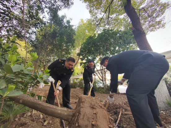 活動得到了全體干部職工的積極響應,在荊州海關前院西面灌木區(qū),眾人手持鐵鍬、鋤頭,一同挖坑、扛苗、散苗、擺正樹苗、培土澆水,干勁十足,熱火朝天。