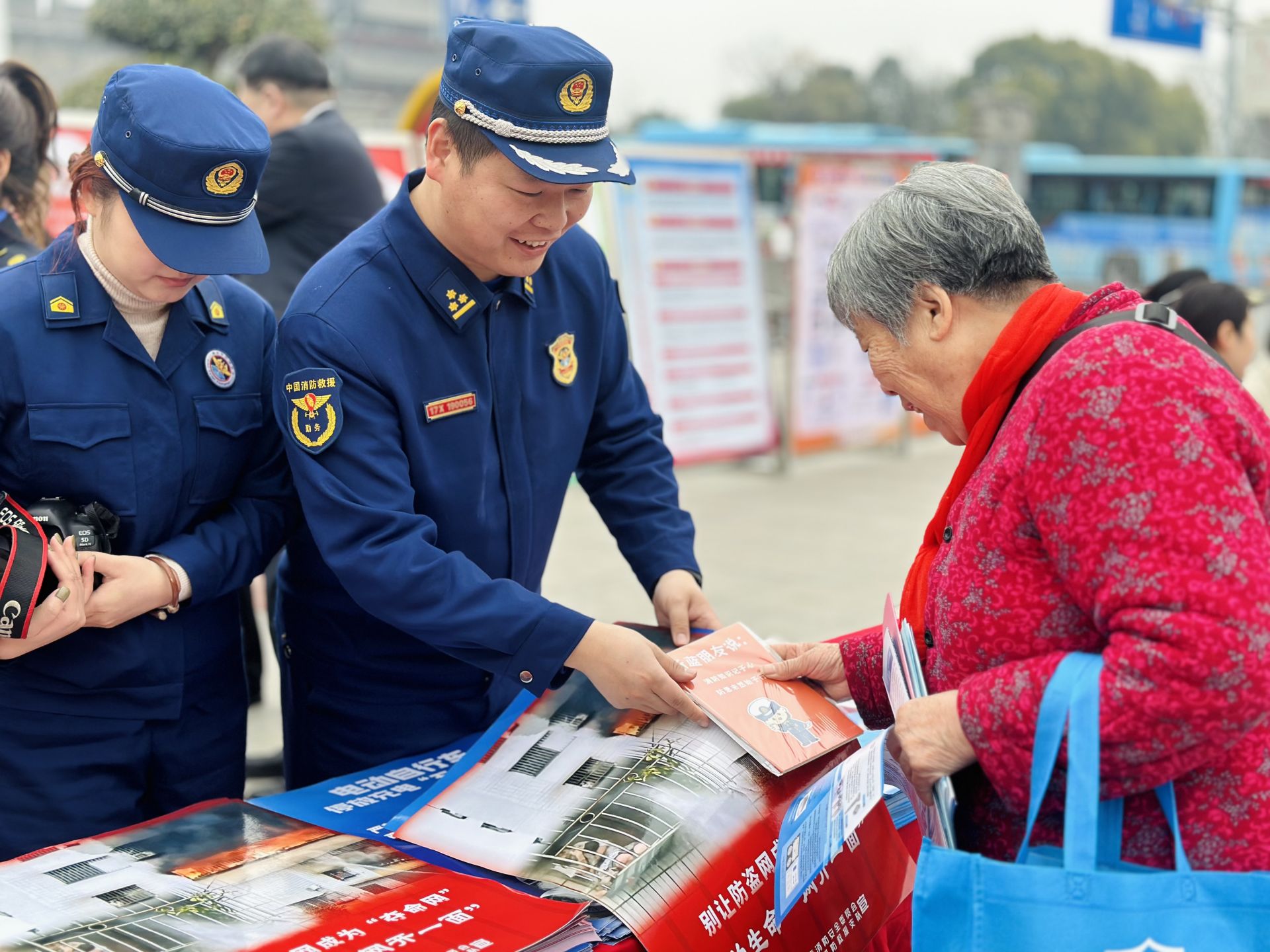 消防宣傳員現(xiàn)場(chǎng)發(fā)放消防宣傳海報(bào)和文創(chuàng)小禮品 喻昭陽(yáng) 攝