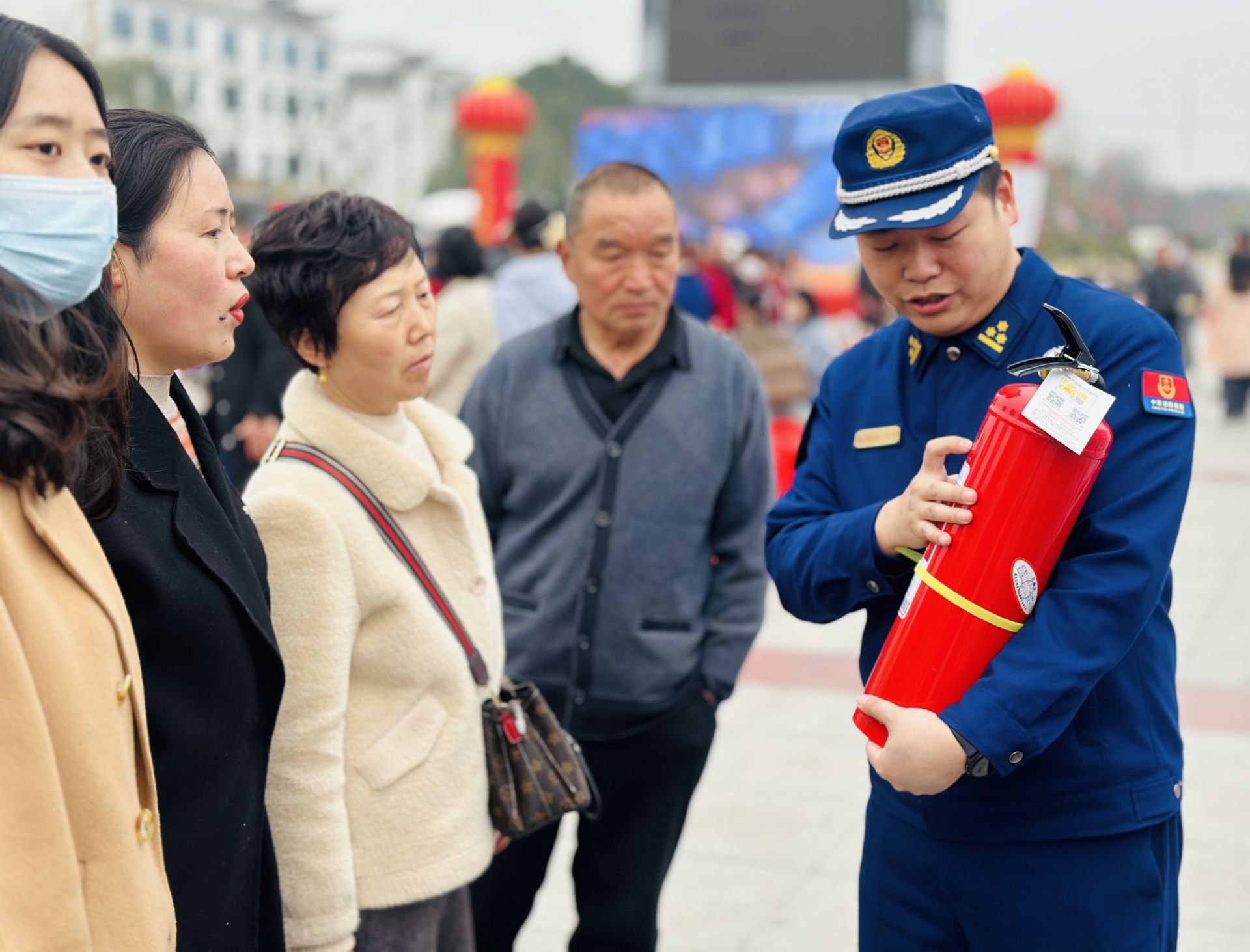 消防宣傳員現(xiàn)場(chǎng)講解逃生面罩使用方法 喻昭陽(yáng) 攝
