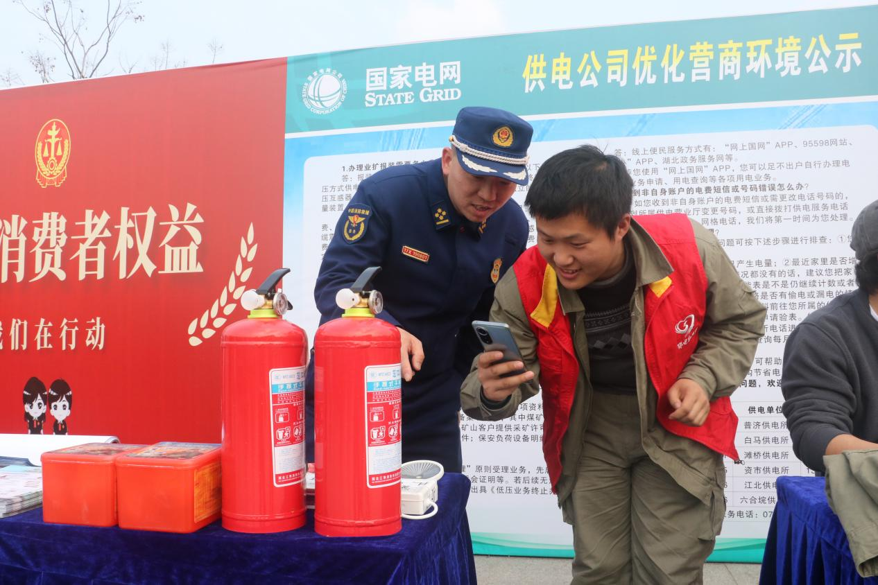 消防宣傳人員引導(dǎo)群眾掃碼查看滅火器身份信息 攝影 陳園