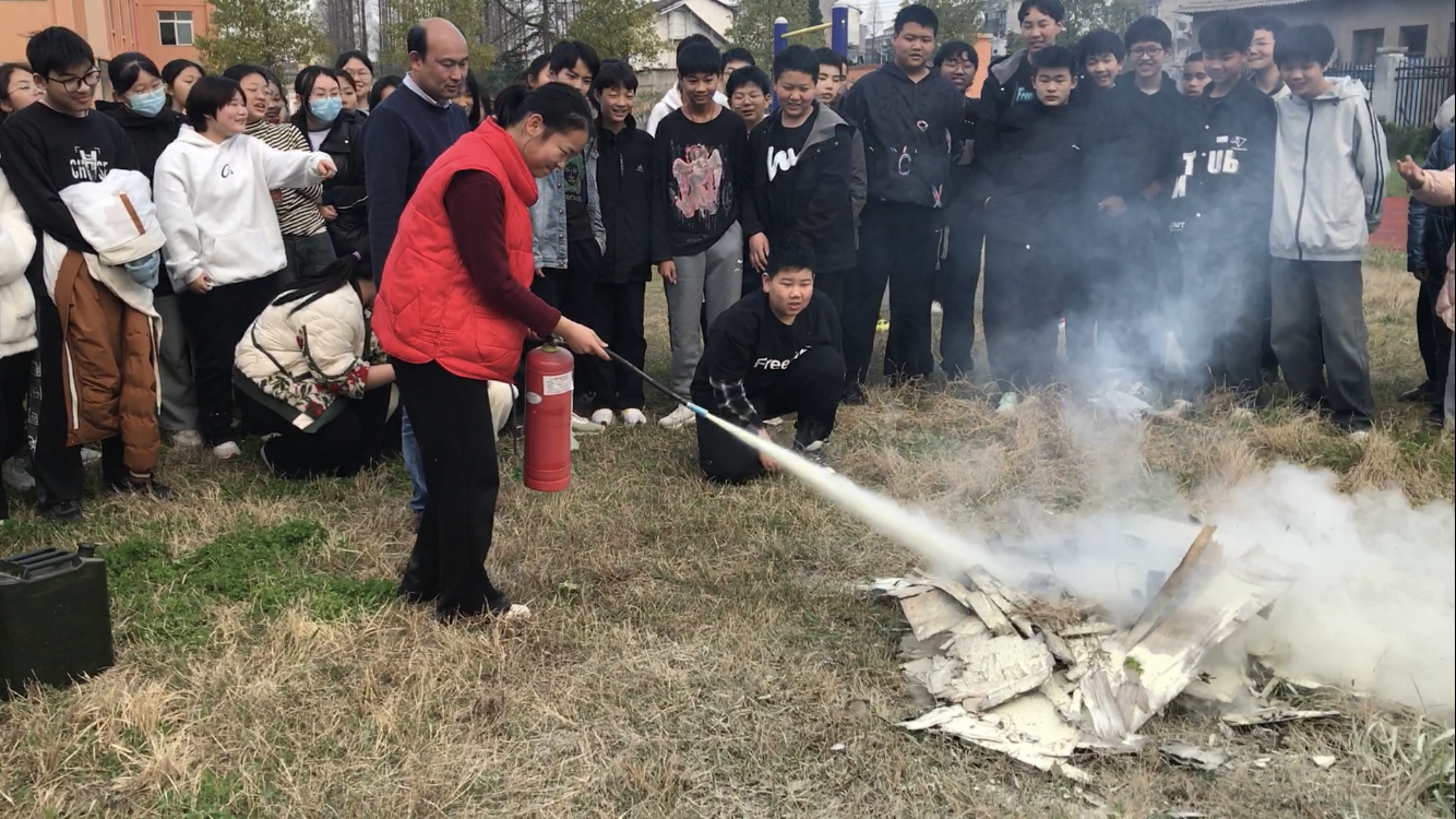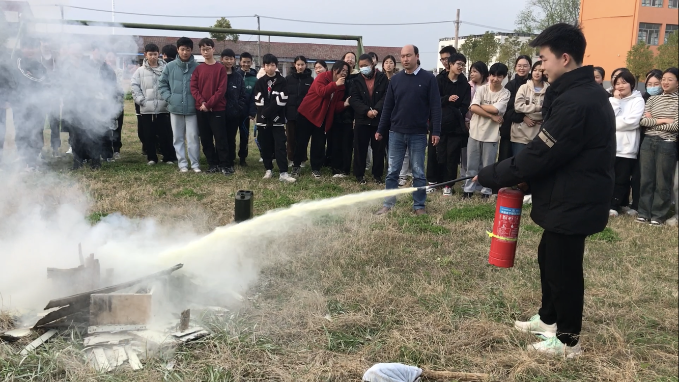 學(xué)校邀請凃濤老師為同學(xué)們講解滅火器的使用和注意事項。為了將理論與實踐緊密結(jié)合,學(xué)校利用廢木材和柴油模擬火災(zāi)現(xiàn)場,每班選擇1到3人參與實戰(zhàn)演習(xí)。