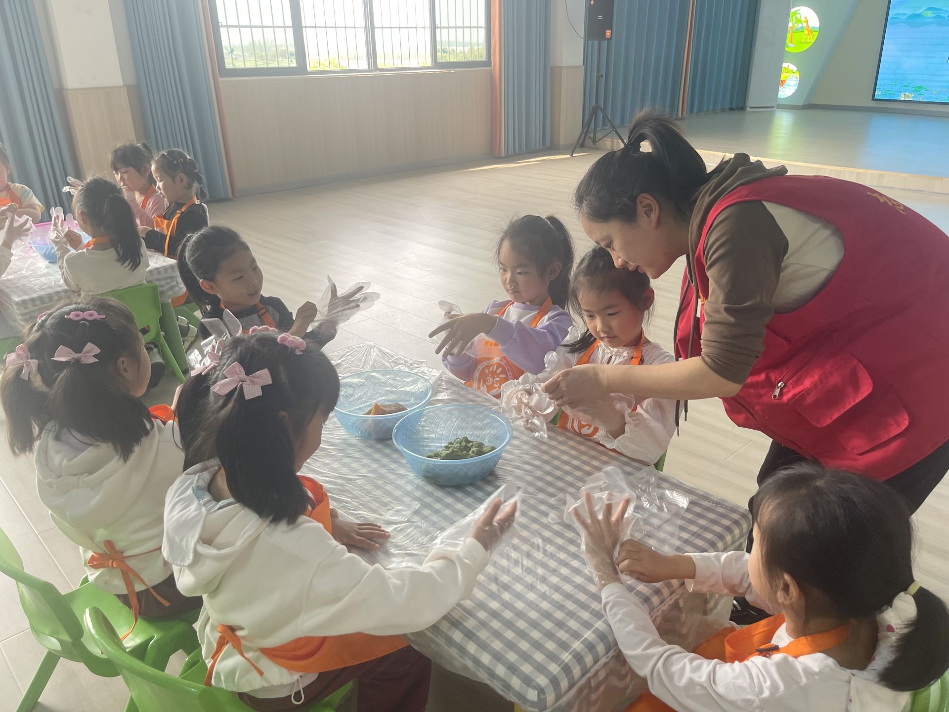 隨后,老師為小朋友講解青團(tuán)的制作,小朋友們目不轉(zhuǎn)睛地觀察著老師教的每一個(gè)步驟,生怕錯(cuò)過(guò)什么,終于輪到孩子們動(dòng)手了,他們一個(gè)個(gè)興致勃勃地制作了起來(lái)。小朋友們從面團(tuán)中取一塊和自己小手差不多大的糯米團(tuán)子,通過(guò)揉、搓、團(tuán)、壓,各種動(dòng)作讓一個(gè)個(gè)糯韌綿軟、油綠如玉的青團(tuán)制作完成啦。